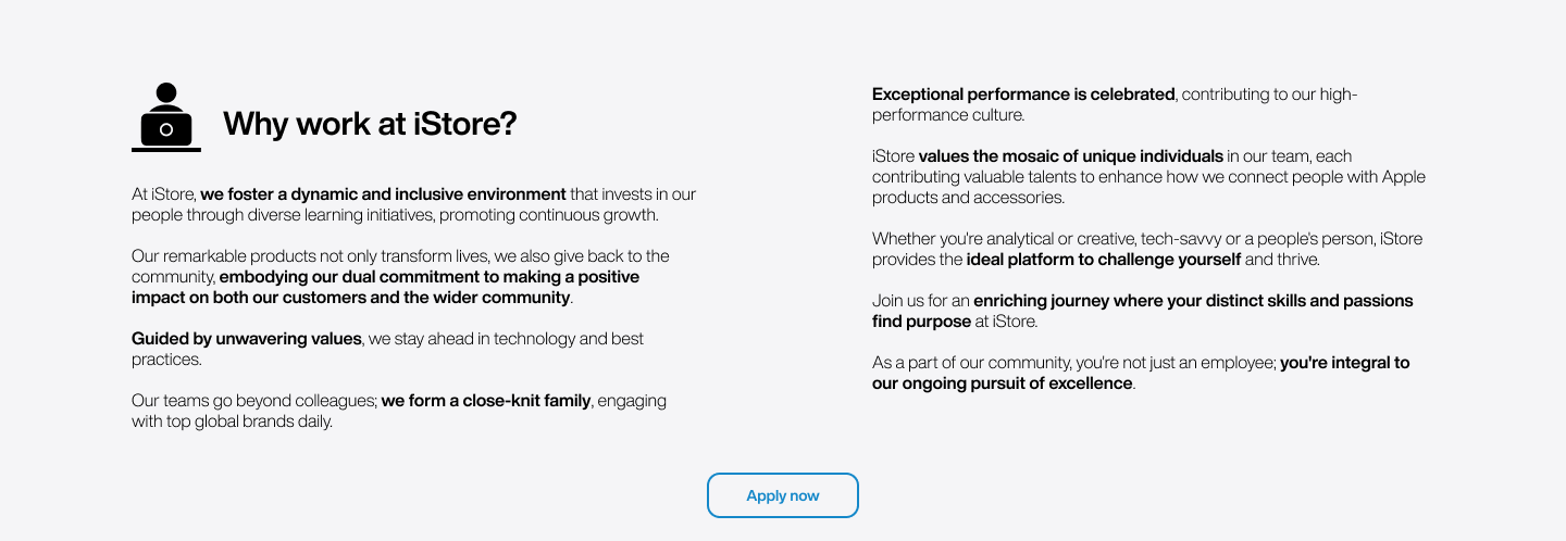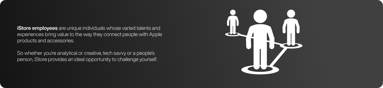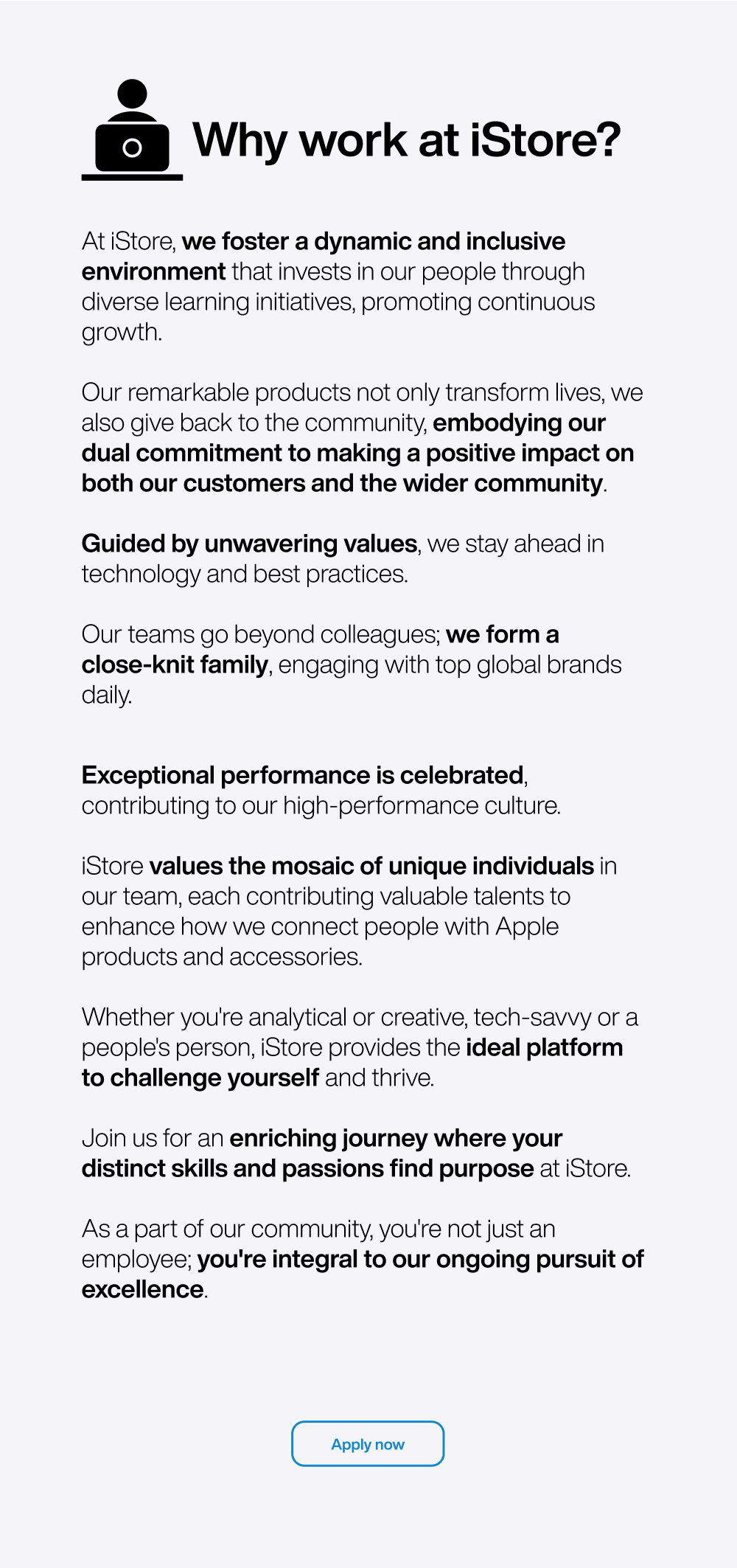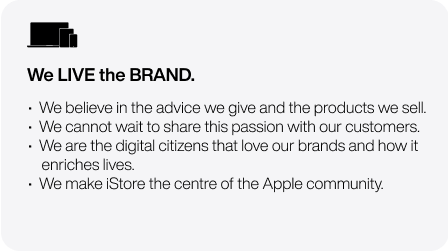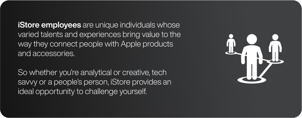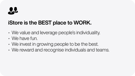 At iStore our values are at the centre of everything we do. Our customer experience is everything means we go the extra mile in order to offer solutions to change peoples’ lives. We give it our best everyday means bringing our ‘A’ game every single day, with every customer interaction. We live the brand means loving and knowing all of our amazing products. iStore is the best place to work because we are a family, we have fun and we invest in learning and growing our awesome people.