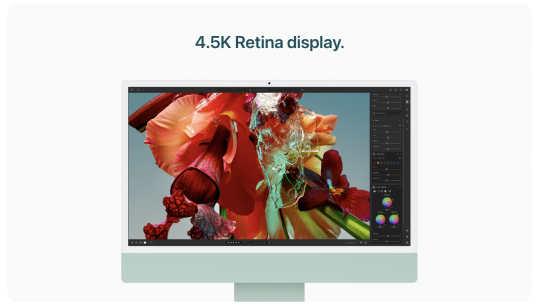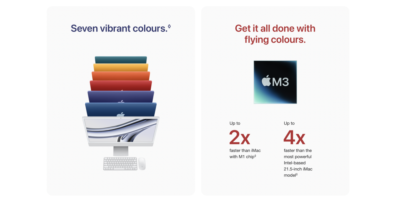 Performance Compared with Intel‑Based 21.5‑inch iMac Model: Testing conducted by Apple in September and October 2023 using pre-production 24‑inch iMac systems with Apple M3, 8‑core CPU and 10‑core GPU, as well as production 3.0GHz 6‑core Intel Core i5–based 21.5-inch iMac systems with Radeon Pro 560X with 4GB of GDDR5 memory, all configured with 8GB of RAM and 256GB SSD. Tested using Super Resolution with Photomator 3.1.2 and a 4.4MB image. Performance tests are conducted using specific computer systems and reflect the approximate performance of iMac.
