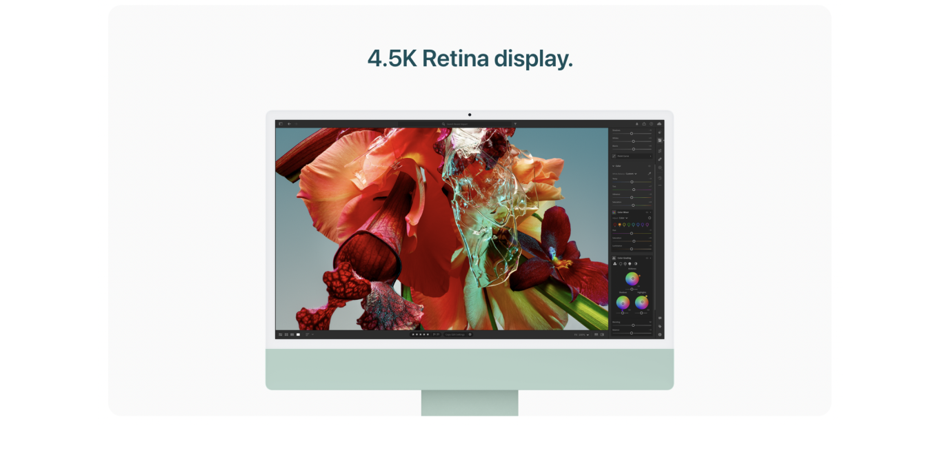 Performance Compared with 24‑inch iMac (M1): Testing conducted by Apple in September and October 2023 using pre-production 24‑inch iMac systems with Apple M3, 8‑core CPU, 10‑core GPU, 24GB of RAM and 2TB SSD, as well as production 24‑inch iMac systems with Apple M1, 8‑core CPU, 8‑core GPU, 16GB of RAM and 2TB SSD. Adobe Premiere Pro (Beta) 24.1 tested with Scene Edit Detection using a 2-minute and 19-second project with Apple ProRes 422 HQ media, at 1920x1080 resolution and 23.98 frames per second. Performance tests are conducted using specific computer systems and reflect the approximate performance of iMac.