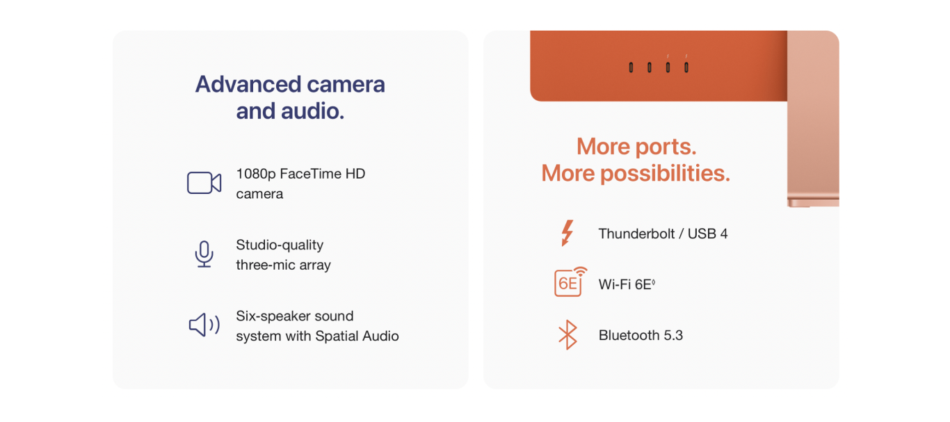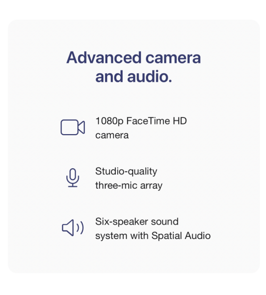 Display: Screen size is measured diagonally. Actual diagonal screen size of the 24‑inch iMac is 23.5 inches. The displays on the 13‑inch and 15‑inch MacBook Air with M2 and the 14‑inch and 16‑inch MacBook Pro have rounded corners at the top. When measured as a standard rectangular shape, the screens are 13.6 inches, 15.3 inches, 14.2 inches and 16.2 inches diagonally (actual viewable area is less).