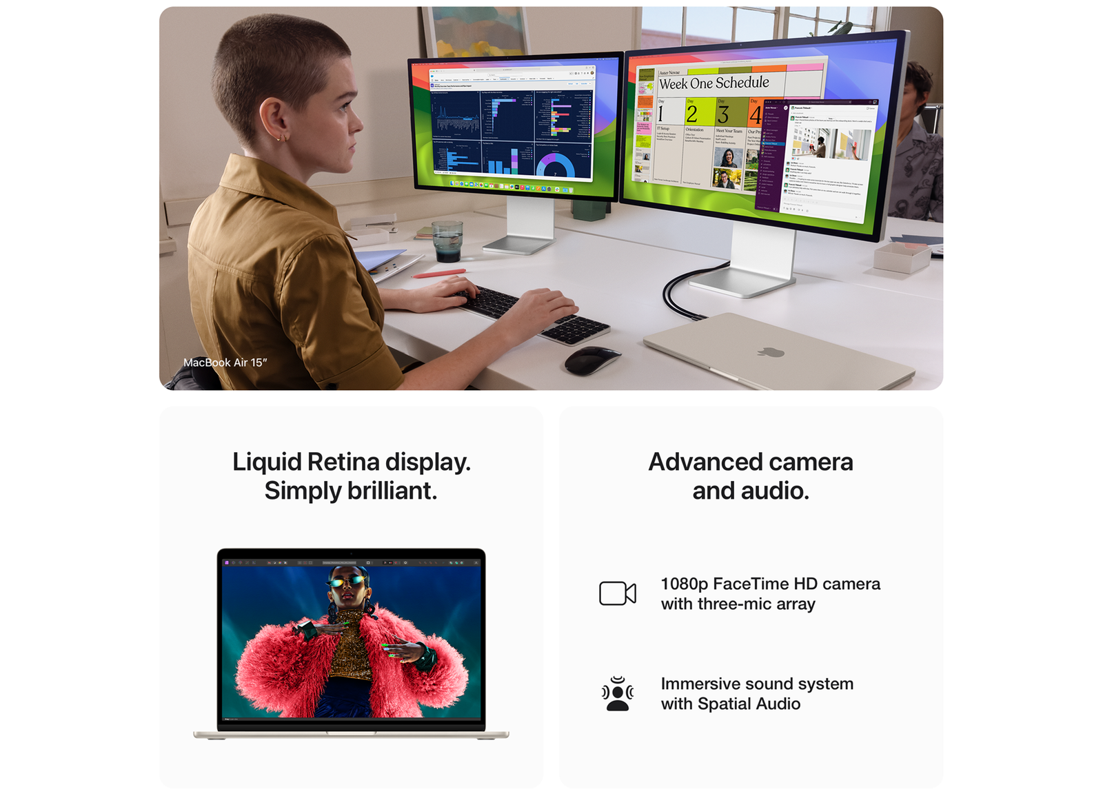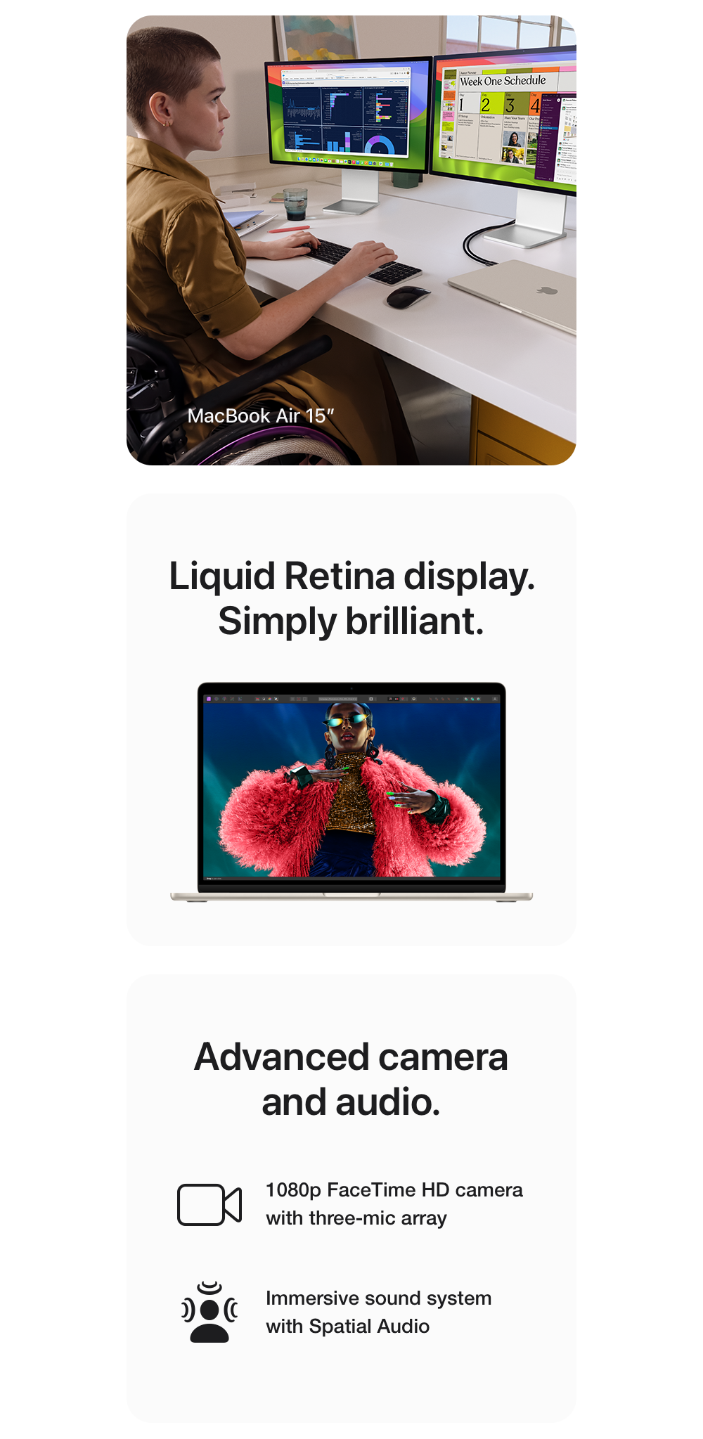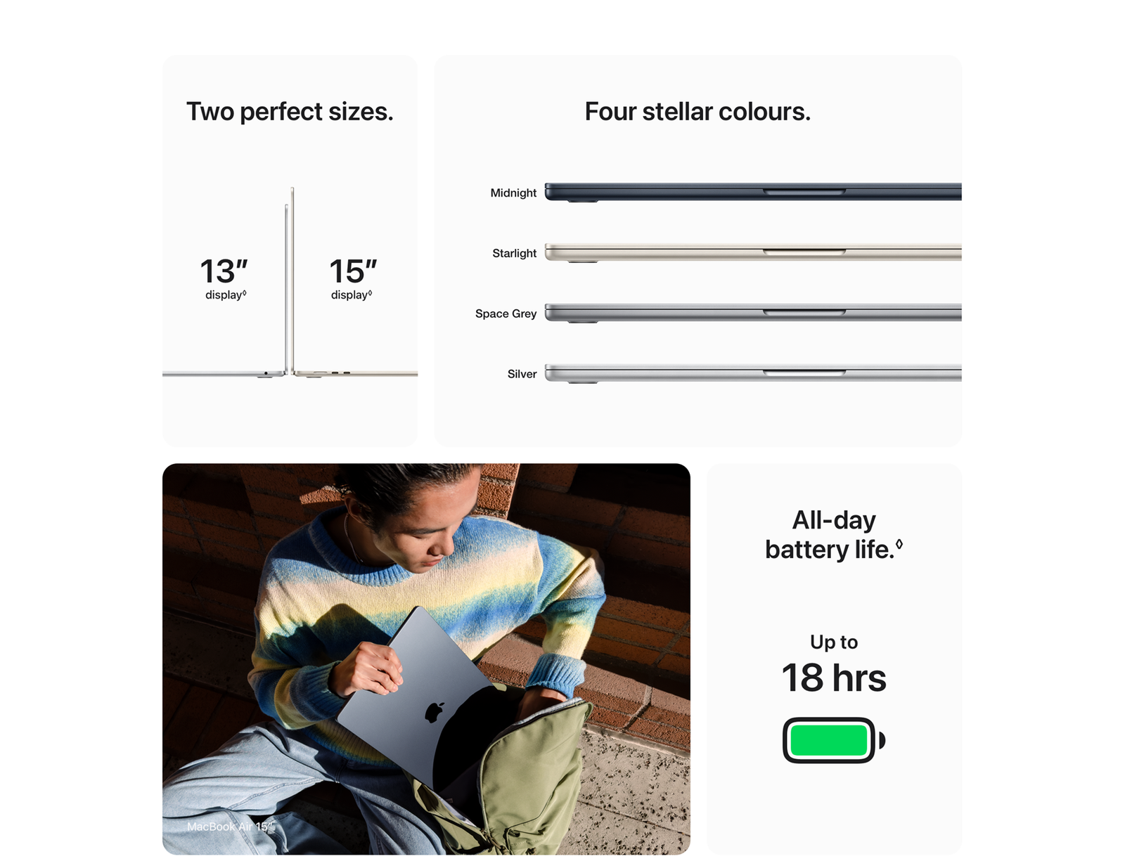 Display: Screen size is measured diagonally. Actual diagonal screen size of the 24‑inch iMac is 23.5 inches. The displays on the MacBook Air with M1 chip and 13‑inch MacBook Pro measure 13.3 inches diagonally. The displays on the 13‑inch MacBook Air with M2 or M3, the 15‑inch MacBook Air, and the 14‑inch and 16‑inch MacBook Pro have rounded corners at the top. When measured as a standard rectangular shape, the screens are 13.6 inches, 15.3 inches, 14.2 inches and 16.2 inches diagonally (actual viewable area is less).