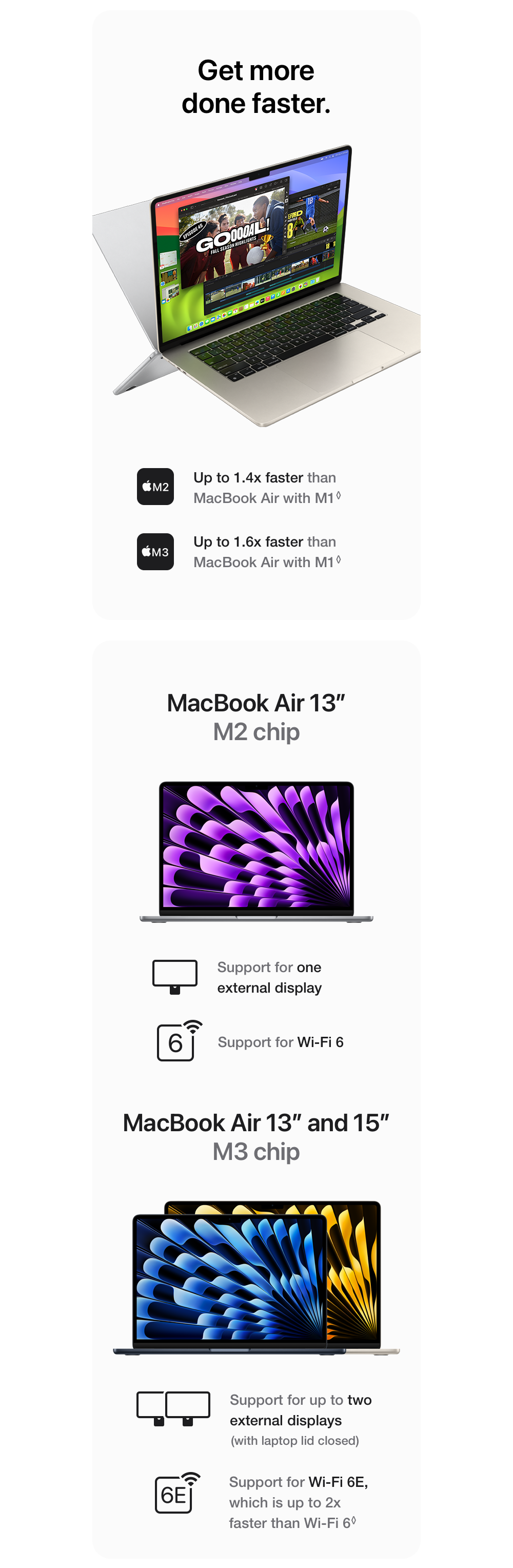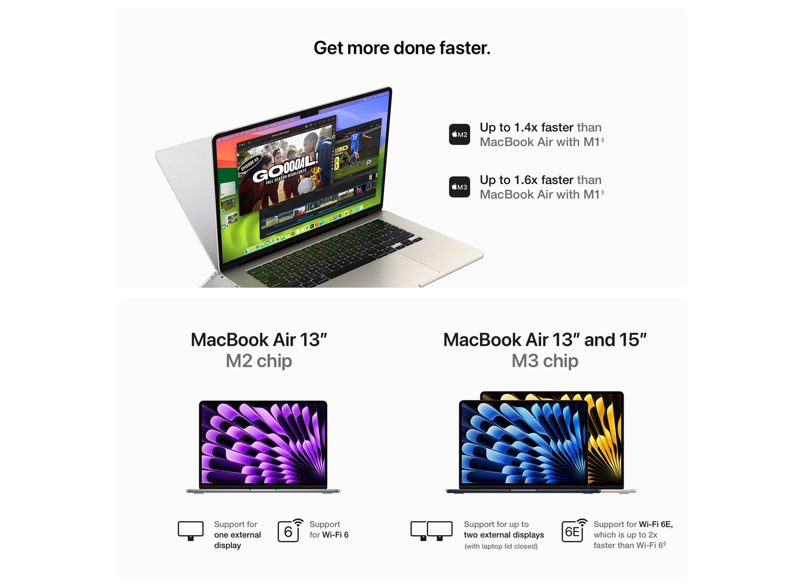 MacBook Air (M2) Performance Compared to MacBook Air (M1): Testing conducted by Apple in May 2022 using pre-production 13‑inch MacBook Air systems with Apple M2, 8‑core CPU, 10‑core GPU and 24GB of RAM, as well as production MacBook Air systems with Apple M1, 8‑core CPU, 8‑core GPU and 16GB of RAM, all configured with 2TB SSD, as well as production 1.6GHz dual‑core Intel Core i5–based MacBook Air systems with Intel UHD Graphics 617, 16GB of RAM and 1TB SSD. Final Cut Pro 10.6.2 tested using a complex 2‑minute project with 4K ProRes 422 media. Performance tests are conducted using specific computer systems and reflect the approximate performance of MacBook Air.