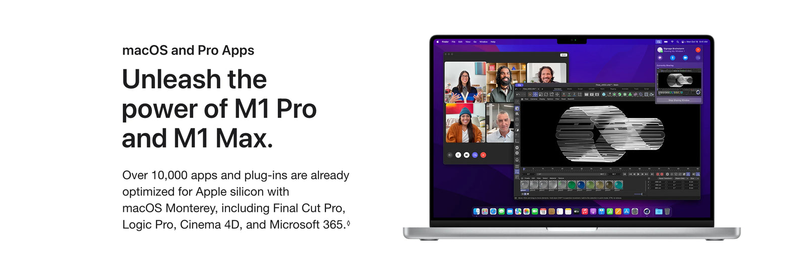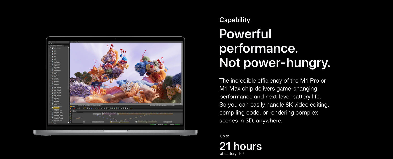 Testing conducted by Apple in September 2021 using preproduction 16-inch MacBook Pro systems with Apple M1 Max, 10-core CPU, and 32-core GPU, as well as production 2.4GHz 8-core Intel Core i9-based 16-inch MacBook Pro systems with Radeon Pro 5600M graphics with 8GB of HBM2, all configured with 64GB of RAM and 8TB SSD. Prerelease Cinema 4D S25 and prerelease Redshift v3.0.54 tested using a 1.32GB scene. Performance tests are conducted using specific computer systems and reflect the approximate performance of MacBook Pro.