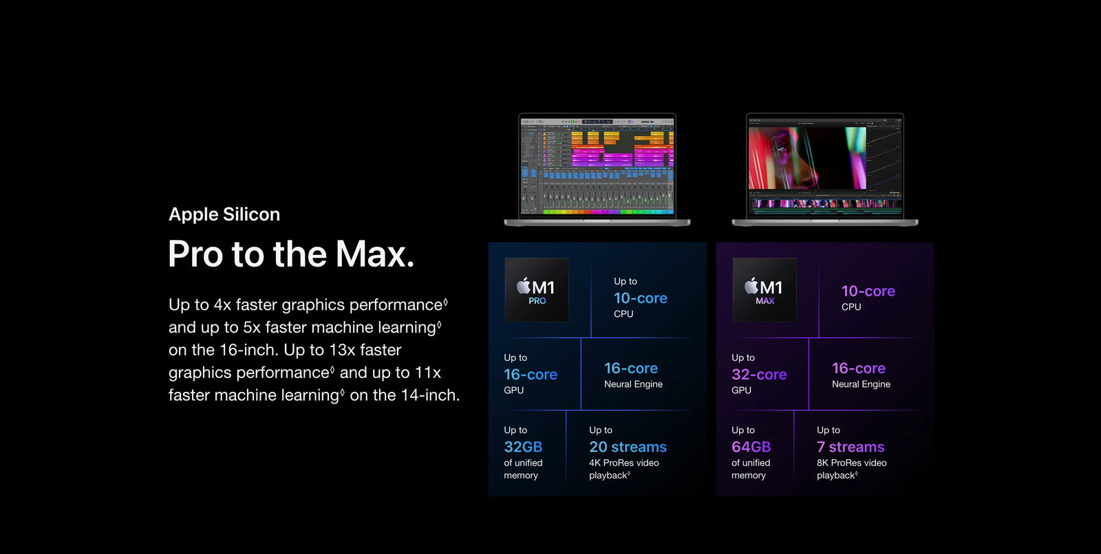 Testing conducted by Apple in September 2021 using preproduction 16-inch MacBook Pro systems with Apple M1 Max, 10-core CPU, 32-core GPU, 64GB of RAM, and 8TB SSD. Prerelease Final Cut Pro 10.6 tested using a 1-minute picture-in-picture project with 7 streams of Apple ProRes 422 video at 8192x4320 resolution and 30 frames per second. Performance tests are conducted using specific computer systems and reflect the approximate performance of MacBook Pro.