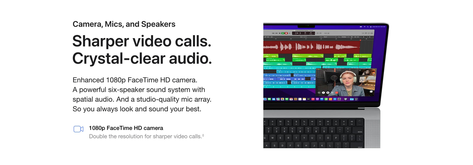 Testing conducted by Apple in September 2021 using preproduction 16-inch MacBook Pro systems with Apple M1 Pro, 10-core CPU, 16-core GPU, 32GB of RAM, and 8TB SSD. Prerelease Final Cut Pro 10.6 tested using a 1-minute picture-in-picture project with 20 streams of Apple ProRes 422 video at 3840x2160 resolution and 29.97 frames per second. Performance tests are conducted using specific computer systems and reflect the approximate performance of MacBook Pro.